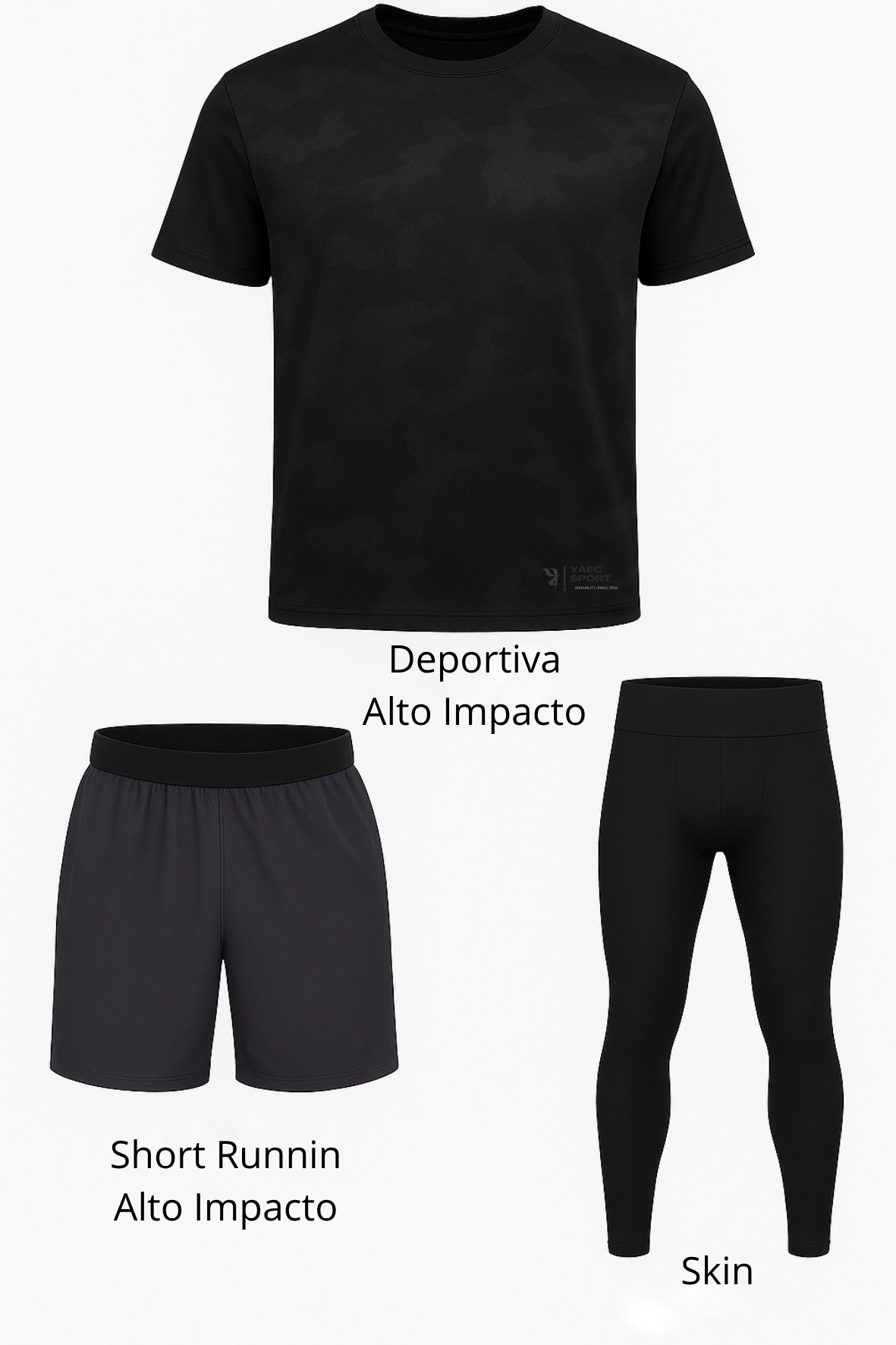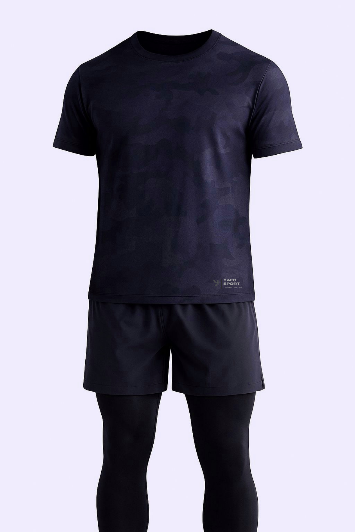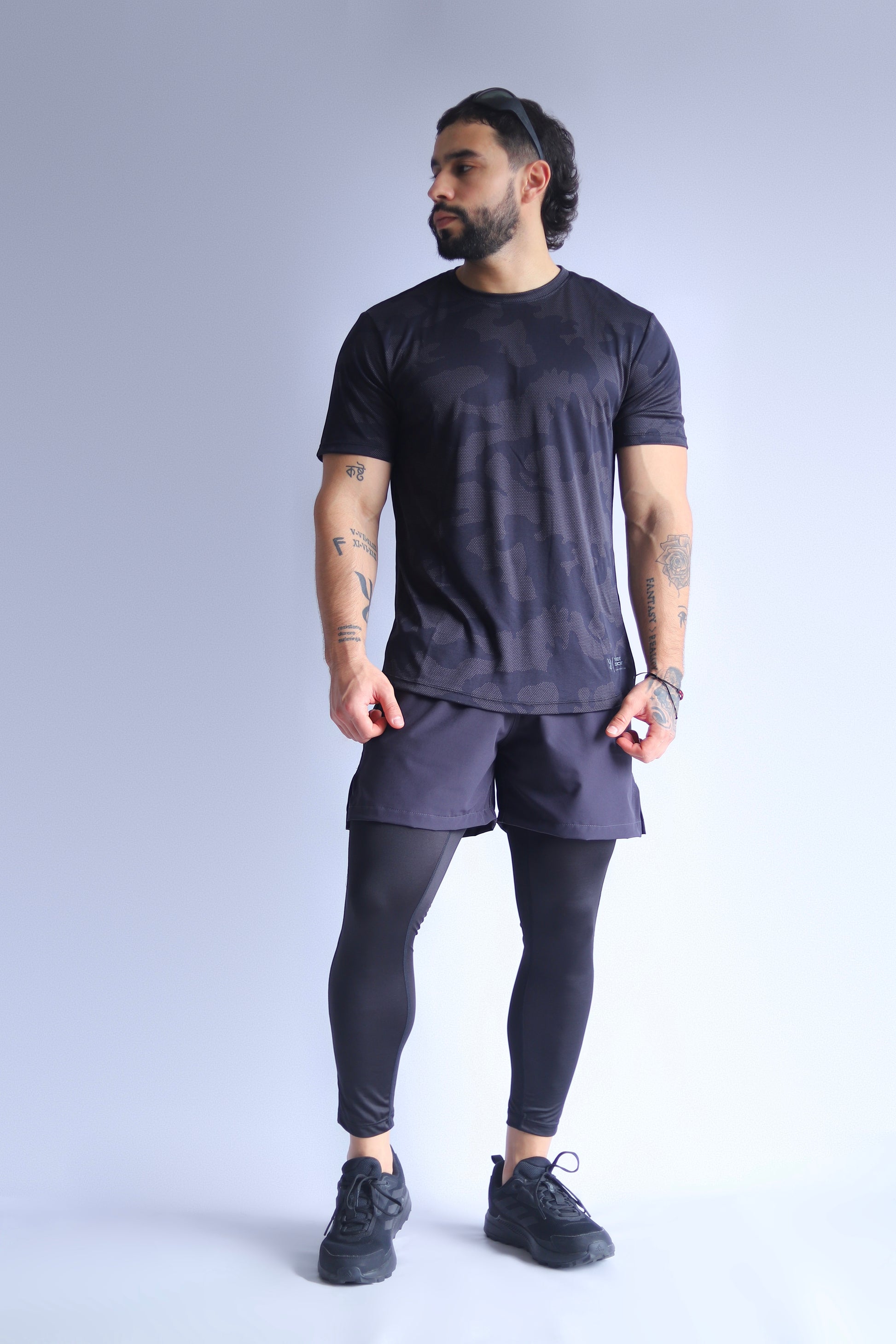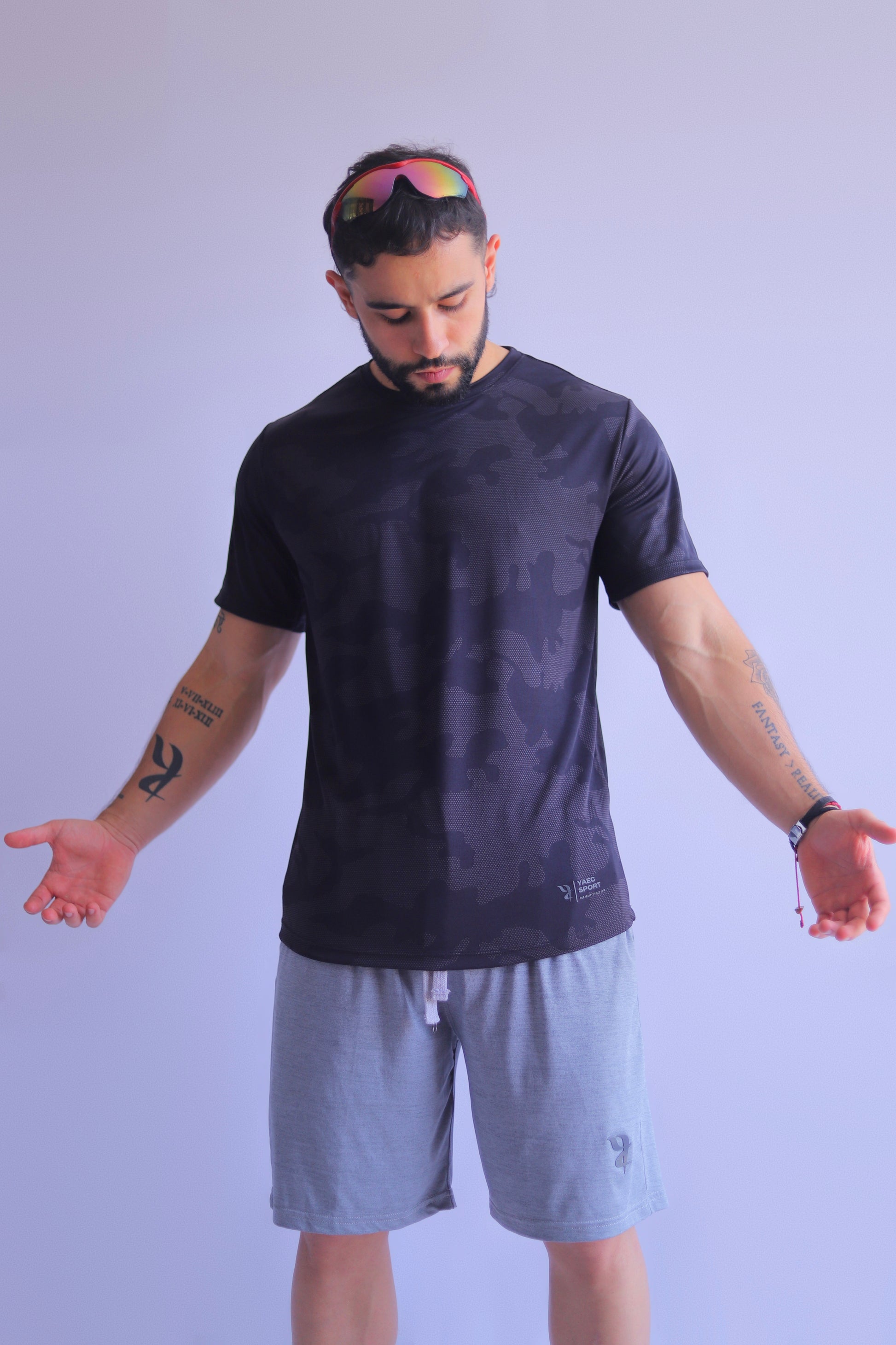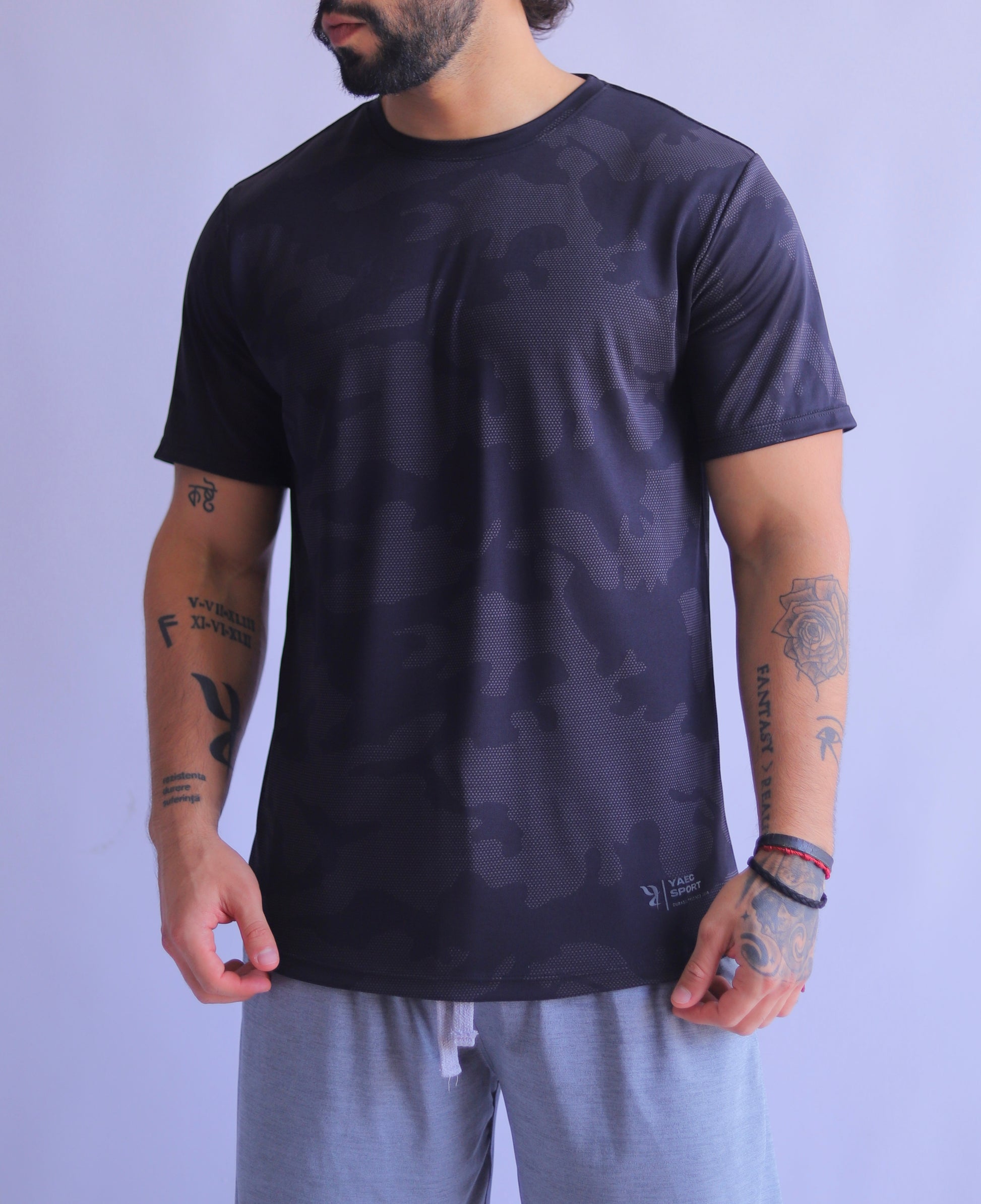 • Camiseta deportiva alto impacto – Negra con grabado camuflado – Tallas S, M, XL